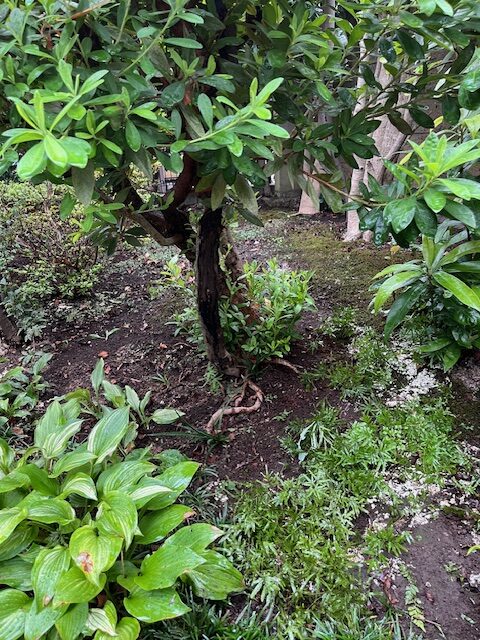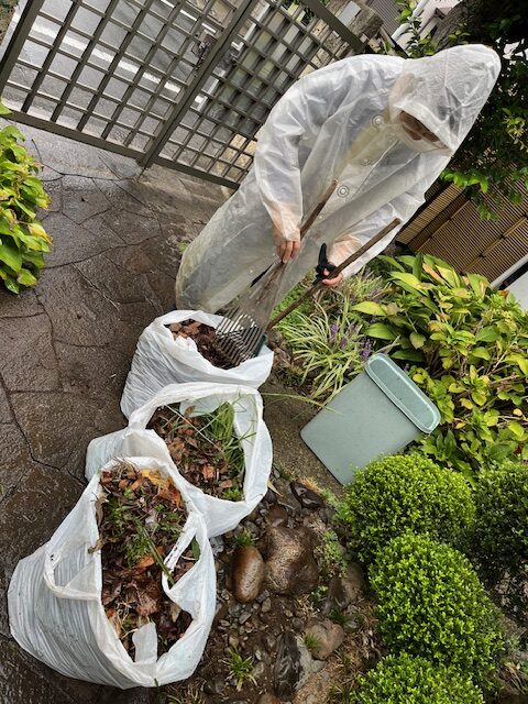 この後、メゾンの前庭の手入れをしました。夏の間、目を背けてさぼっていましたが、雨がふり草元気になってきたので、落ち葉をかき集めて雑草を抜いて。