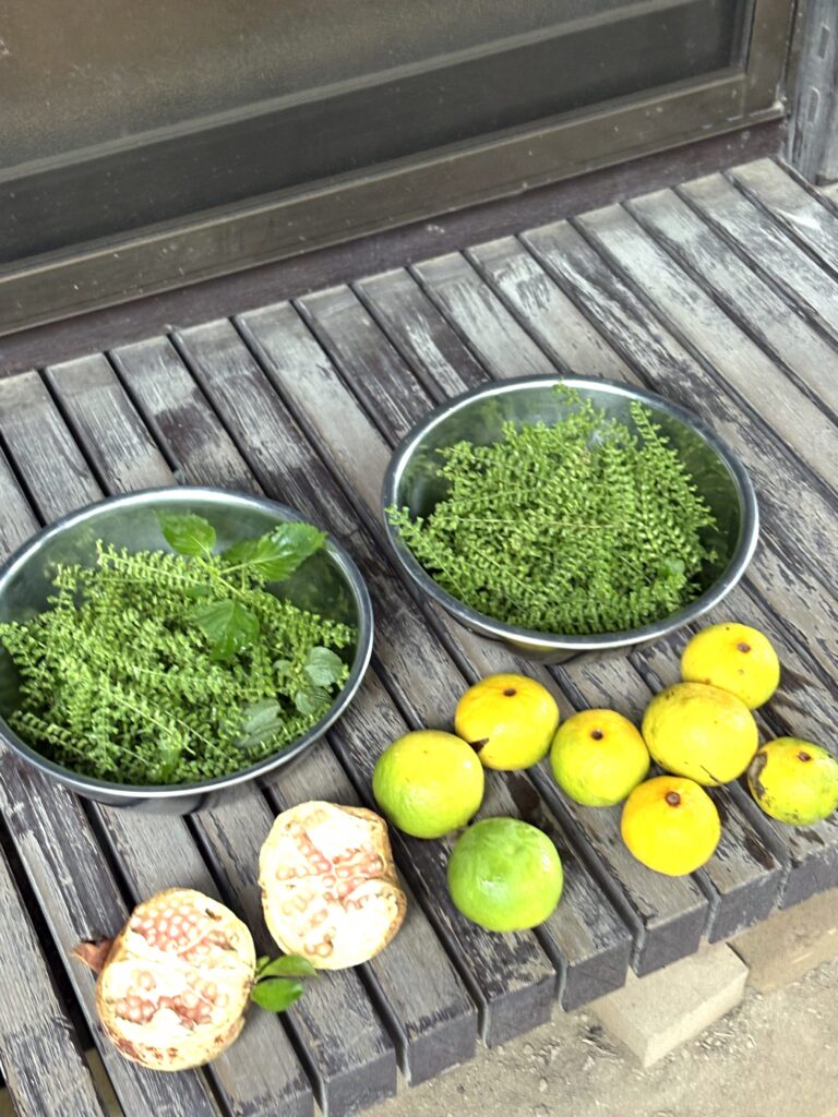 ちょうどシソの穂が実り始めたので、まず、収穫。しょうゆ漬けにしてご飯のお供にするつもり。そして夏枯れで木が自ら落とした実、私は放置していたのを加家美さんが収穫。皮は香りがいいけれど、中身はどんなかな? ついでに、大きくなってきたけどまだ白いザクロもひとつ採ってみたら、中も白いけどつぶは太ってきたので、おやつに。