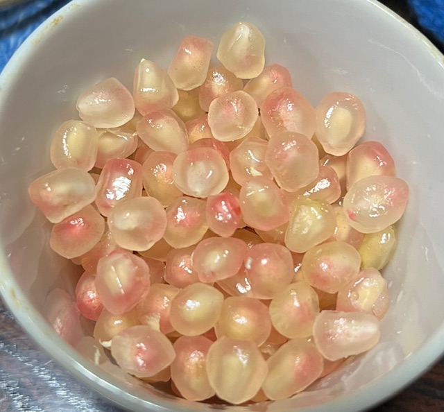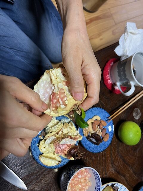 お茶タイムには黒大豆茶が松村さんにも好評。意外に甘くなっていたザクロは、食べるのが面倒だけれど、タネがまだ柔らかく噛めるので食べやすい。もっと赤くもっと美味しくもっと美しくなーれ。