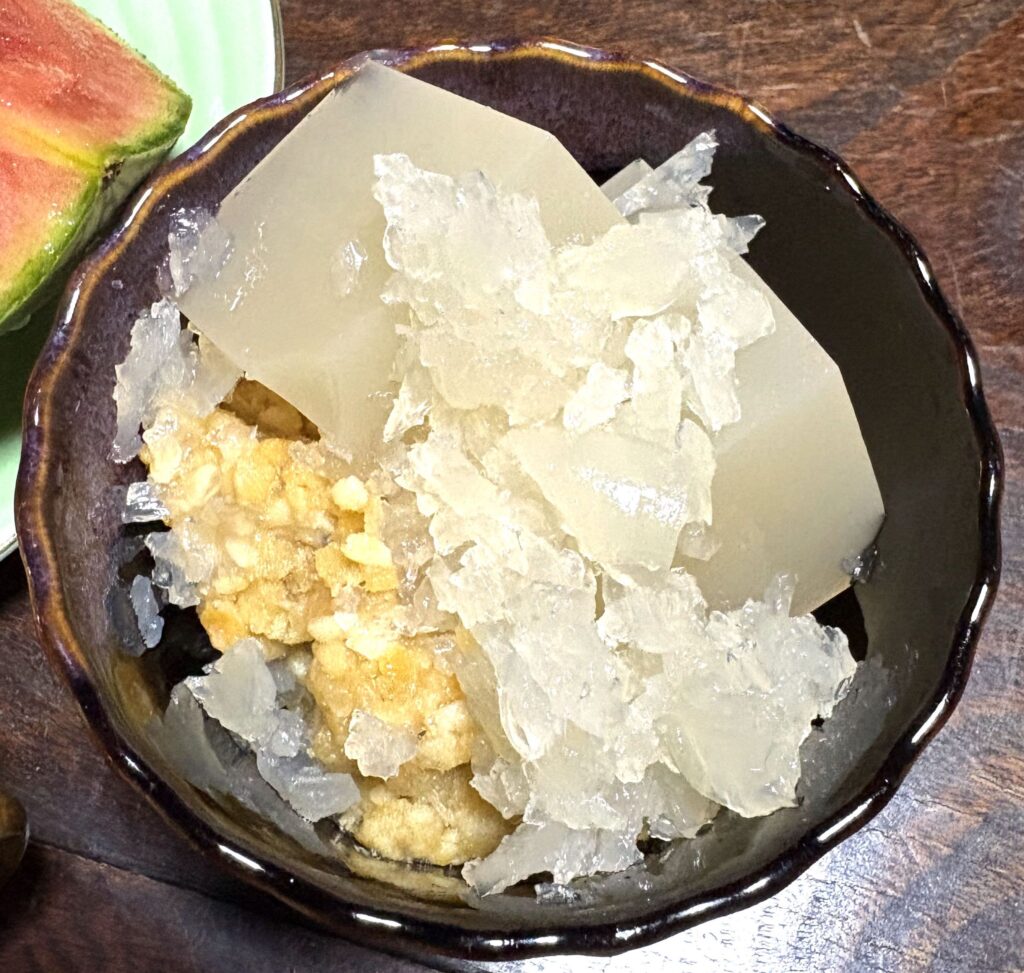 加家美さんお手製の寒天デザート「スジョングァ風ぷるるん」。私が作ったレンズ豆の麹発酵あんこを添えて。
