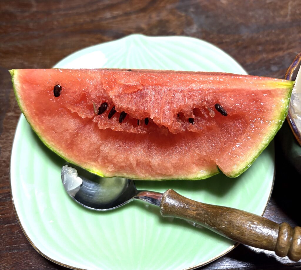 庭の畑のすいか。4個目は遅れて結実し、渇水で葉が枯れてきてあわてて収穫したので、前のよりずっと小玉でしたが、味は抜群!お天道様に感謝です。
