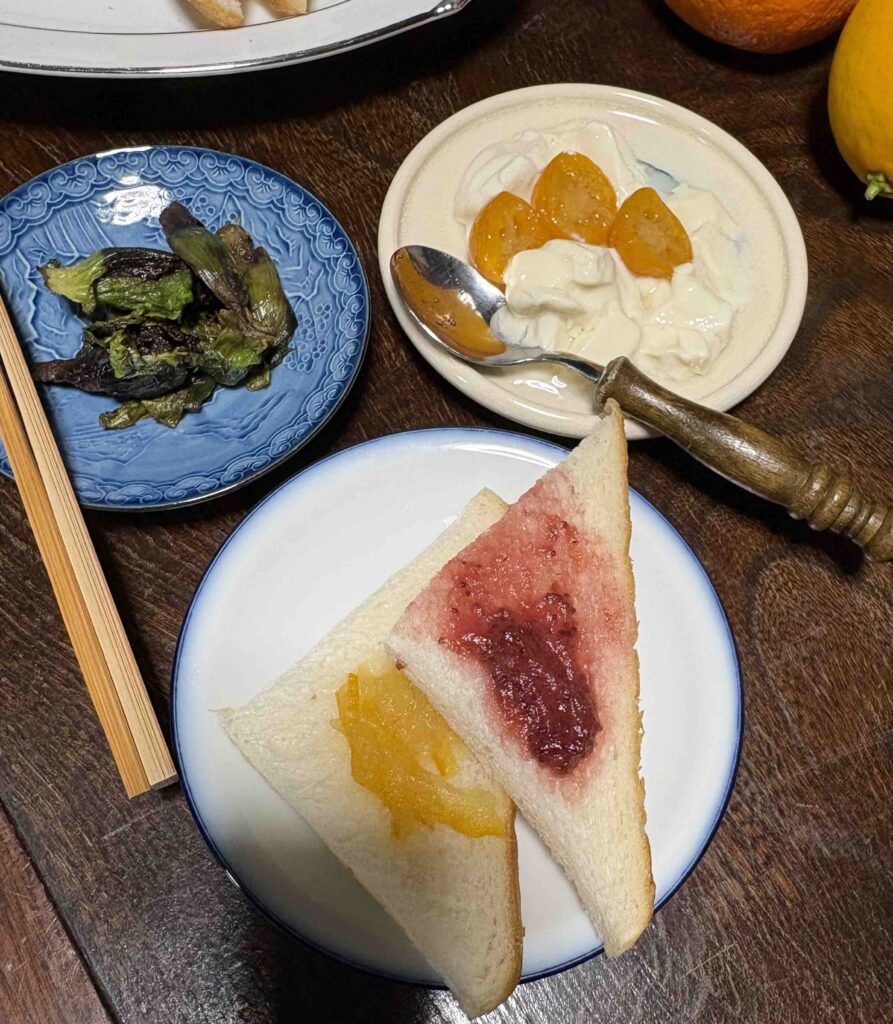 おやつは、内山さんの手作りジャム。前回のユズと、千葉のお友達が作ったイチゴをジャムにしてくださいました。ふきのとうは摘みたては苦味が少ないので、オリーブオイルで炒めて塩。あとは、私の金柑蜂蜜漬け。