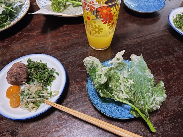 さて、お楽しみのティータイム。今日は春の草を食べることに。フキノトウとアシタバは天ぷらに、ハコベとノビルはおひたしにして。採れたての野草のパワーをいただいて元気が出ます。