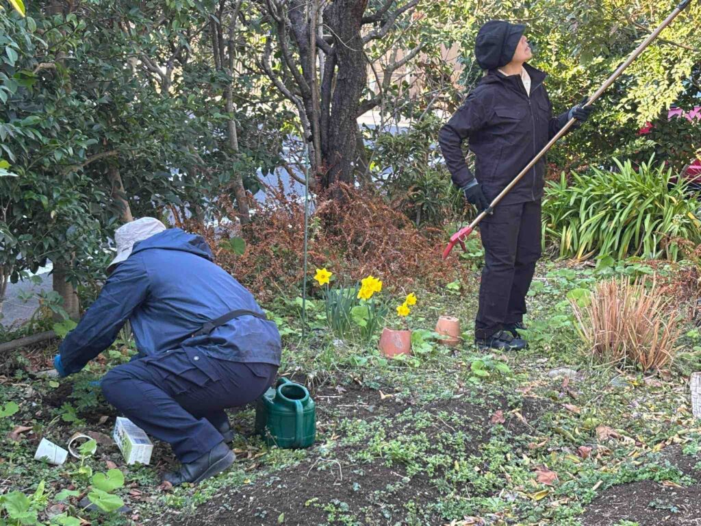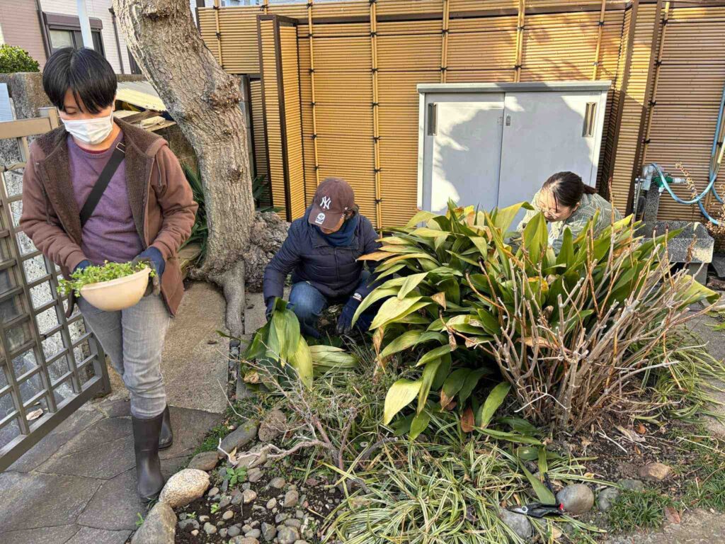 それから、メゾンの庭には、花を楽しんだ後の土が詰まった植木鉢やプランターが散在しているのが気になっていました。そこで、ひさしぶりに参加してくれた登さんを中心に、植木鉢の土を塀沿いに空けて景色をつくる作業をお願いしました。