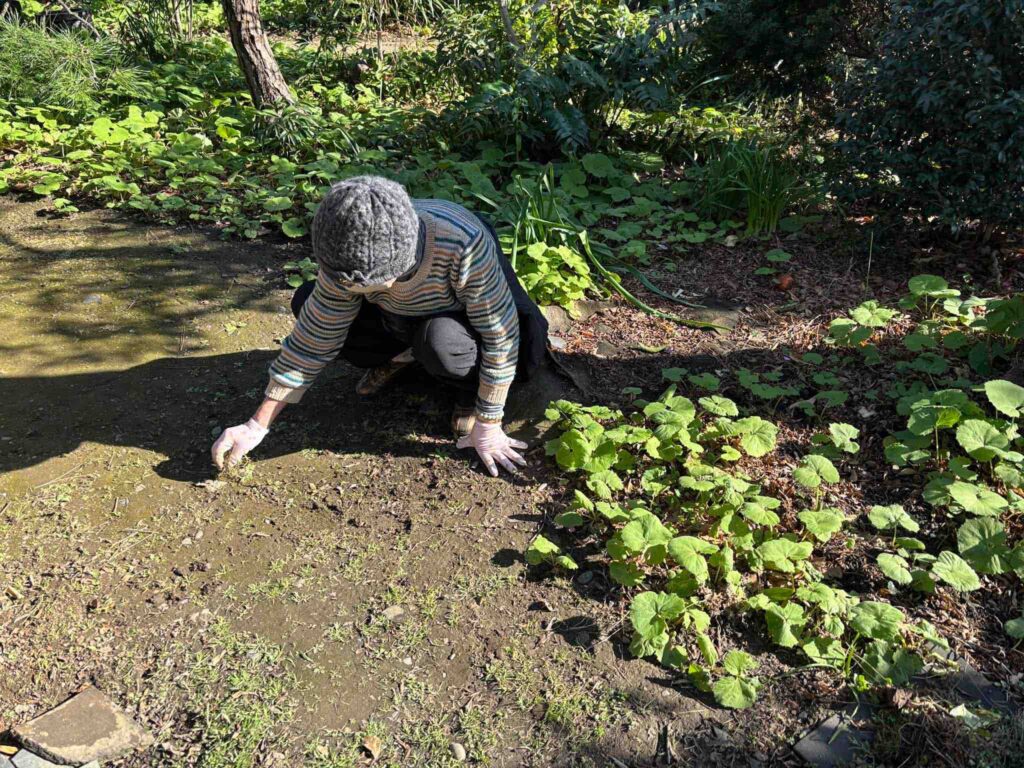 古民家玄関前は特に草がはえないように維持していますが、緑が目立ってきていました。こちらも花がつきタネができる前に根気よく抜いていただき、しばらく安心です。