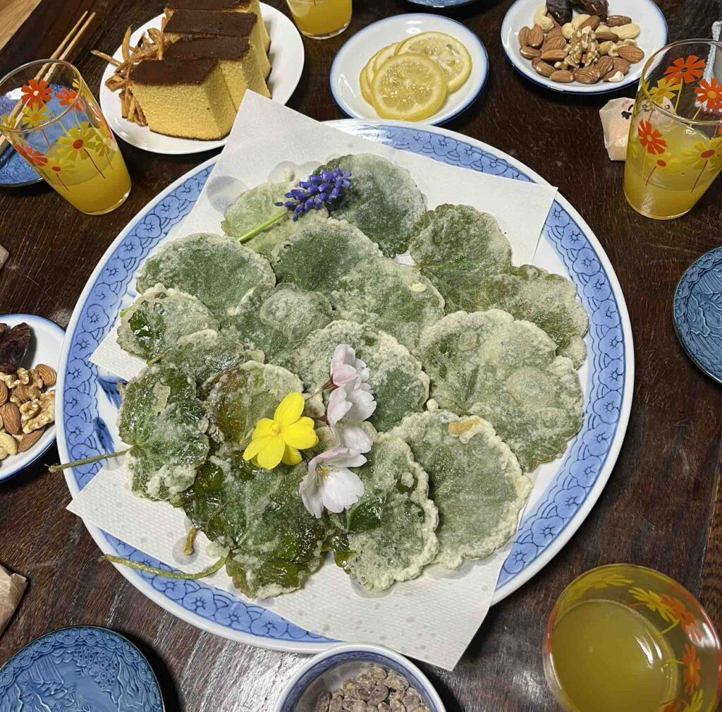 今日のおやつは、前回食べそびれたユキノシタの天ぷらがメイン。古民家の玄関前のイチイの木の下に、たくさんはえています。食べやすそうなサイズを、内山さんが天ぷらに。ほろ苦い野草の味は、天ぷらにすると旨味に変わり、なんとも言えないおいしさです。